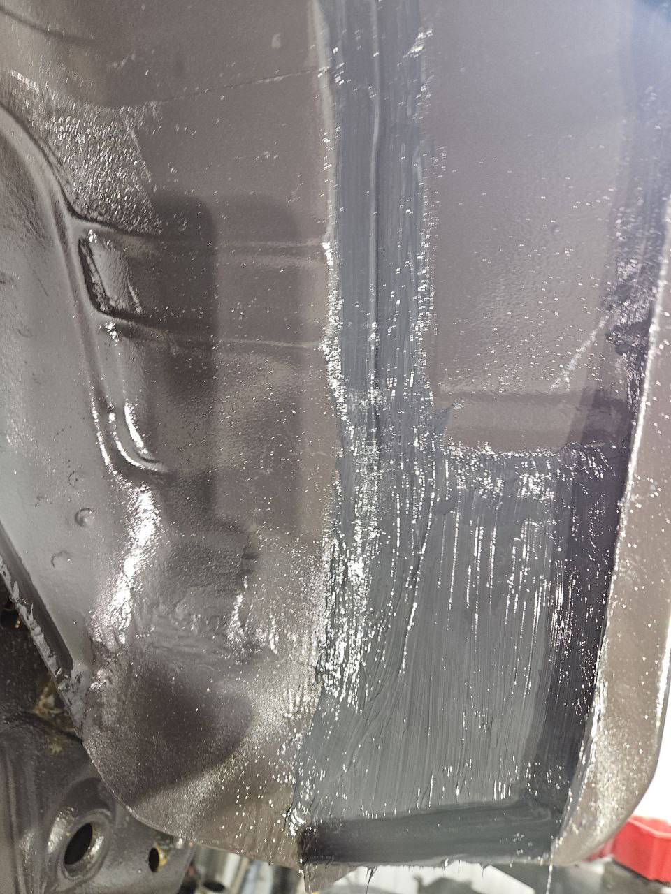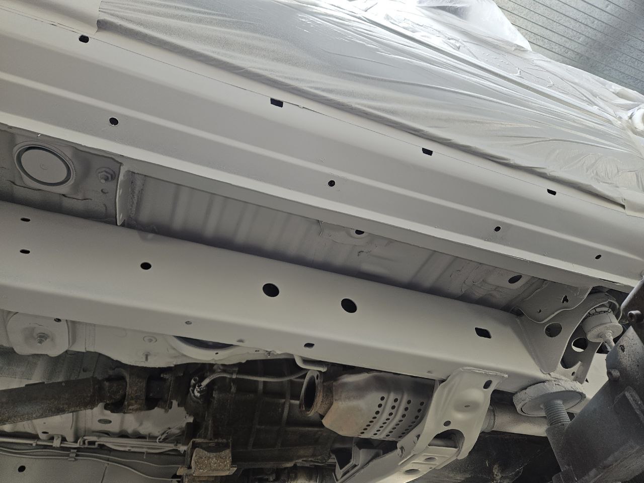 - Лазерная очистка: CW-лазер Raycus 3000 Вт. Рама снизу и с боков, зоны крепления подушек — 1300 Вт. Задние арки, канты, задняя часть днища — ~800 Вт, многопроходная техника (тонкий металл 0,8–1,0 мм). Результат: чистый металл Sa 2–2½. Старый герметик арок удалён полностью.